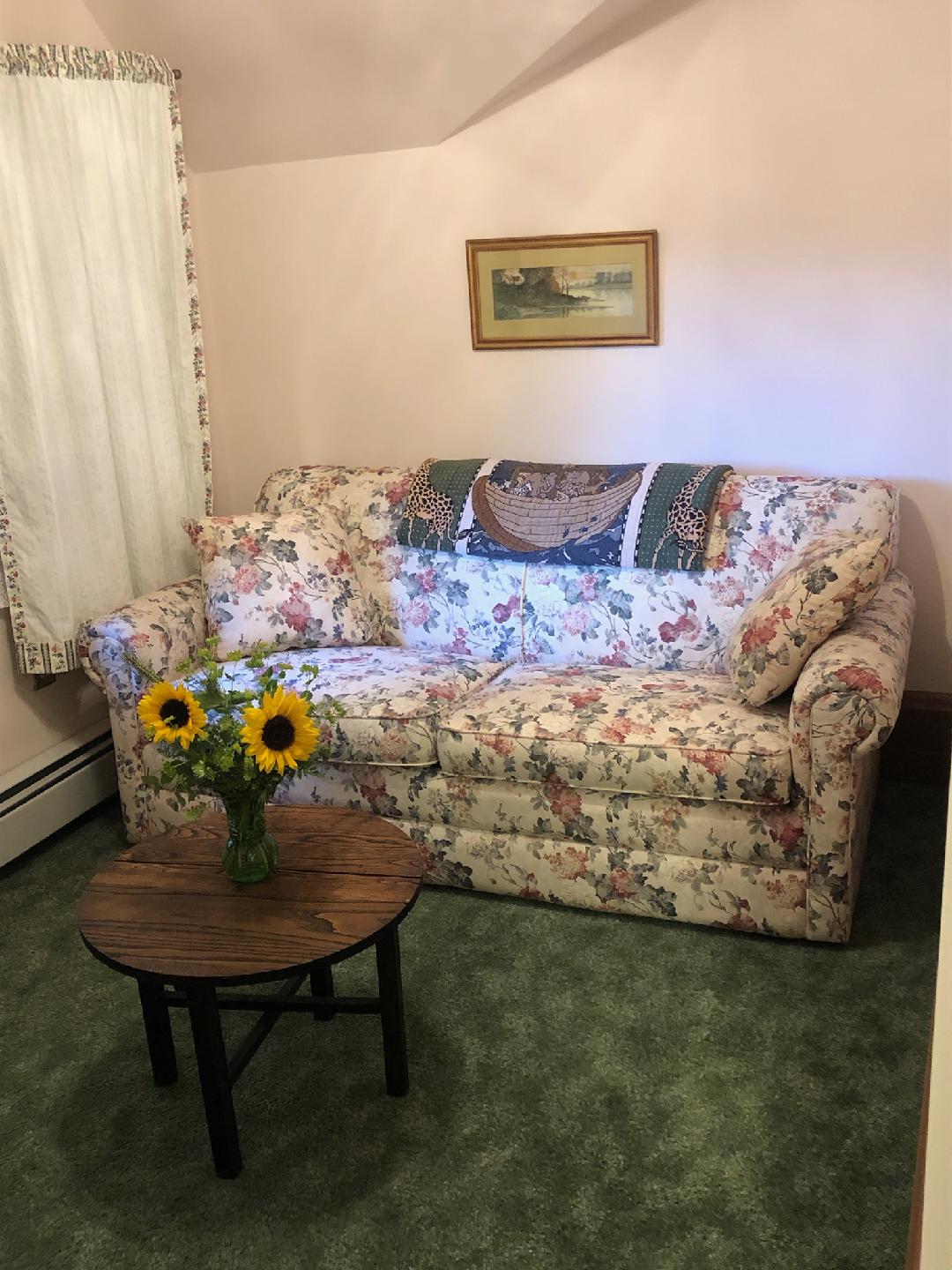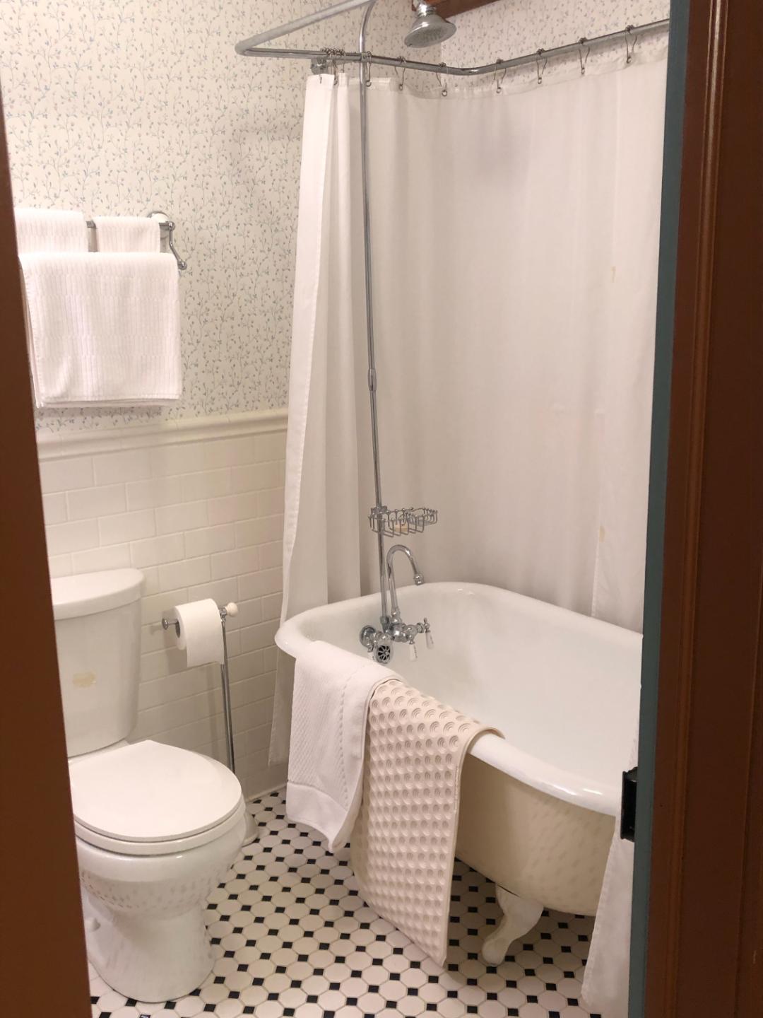 This lovely 3rd-floor room has an attached sitting room with a double sofa bed. The bedroom features a Queen-sized bed and an en suite bathroom with clawfoot tub and shower.
